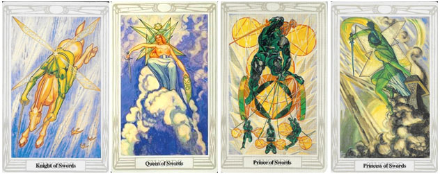 The principal card of the element of Air is the Prince of Swords; being Air of Air or Pure Air. The elemental beings associated with these cards are the Sylphs. Their qualities are as follows: Positive Qualities: Negative Qualities: Fire of Air, the Knight of Swords brings virulent force to these qualities, as Water of Air, the Queen of Cups brings an emotional response to these qualities. And the Princess of Swords is as the Ace of Swords, representing the Intellect of the individual in his or her basic character. |